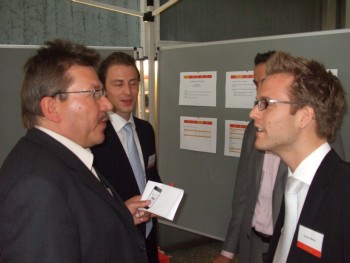 Martin Westermann (Rheinisch-Bergisches TechnologieZentrum), Christoph Heeren, Andreas Metten (Trade Fair Team HOLLYVOTE.com) und Carsten Krause (St@rt, Zentrum für Technologie und Existenzgründung)
